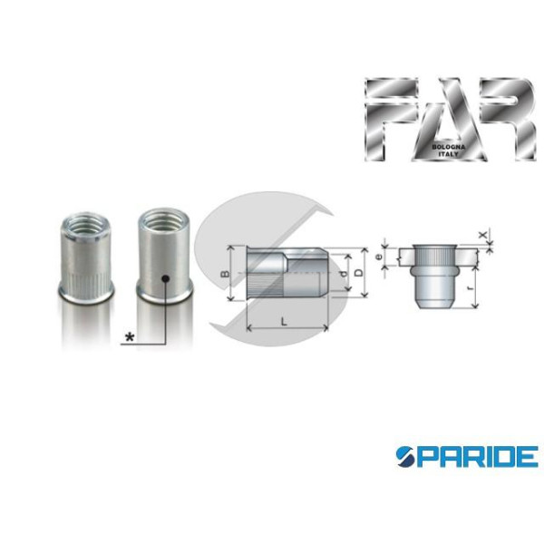 INSERTO FILETTATO ACCIAIO M10 FTR/L FAR CILINDRICO CON TESTA RIDOTTA. INSERTO FILETTATO PER LAMIERE CON CORPO CILINDRICO E FILETTATURA METRICA A PASSO GROSSO M10. INSERTO FILETTATO..