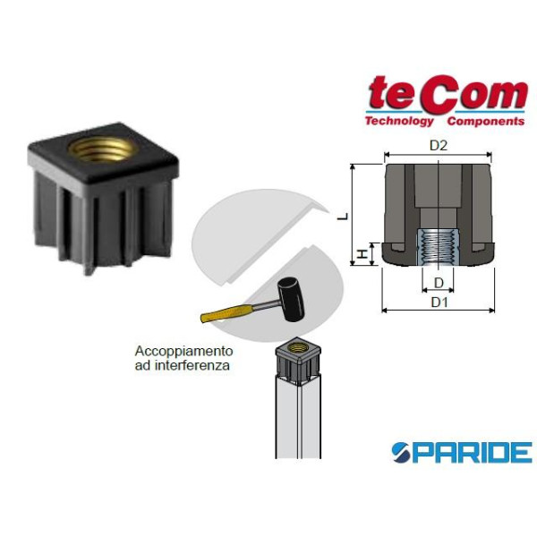 TAPPO FILETTATO QUADRO 40X40 M8 68/80714 CON BUSSOLA IN OTTONE. Carateristiche: Tappo con inserto filettato per tubo quadro 40 mm. Filetto M8 passo grosso. Tappo in poliammid..