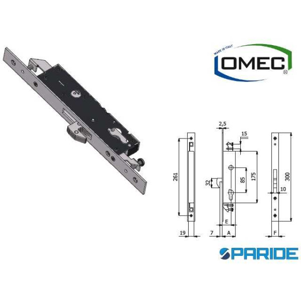 Serratura di sicurezza per montanti, catenaccio e rullo regolabili 3 punti di chiusura 1465 Omec.
